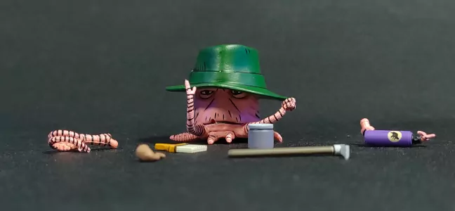 Donde está la gracia es en el Utrom que acompaña a April, conocido como Profesor Obligado. Está esculpido a la perfección, lleva un sombrero que le da un rollo que no veas y viene acompañado de los siguentes elementos que podemos acoplarle: