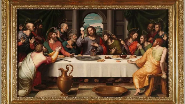 Imagen una obra representando la última cena con el santo grial sobre una mesa